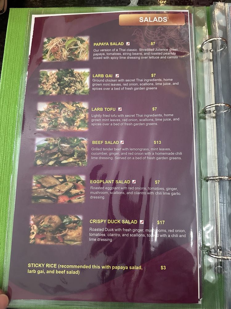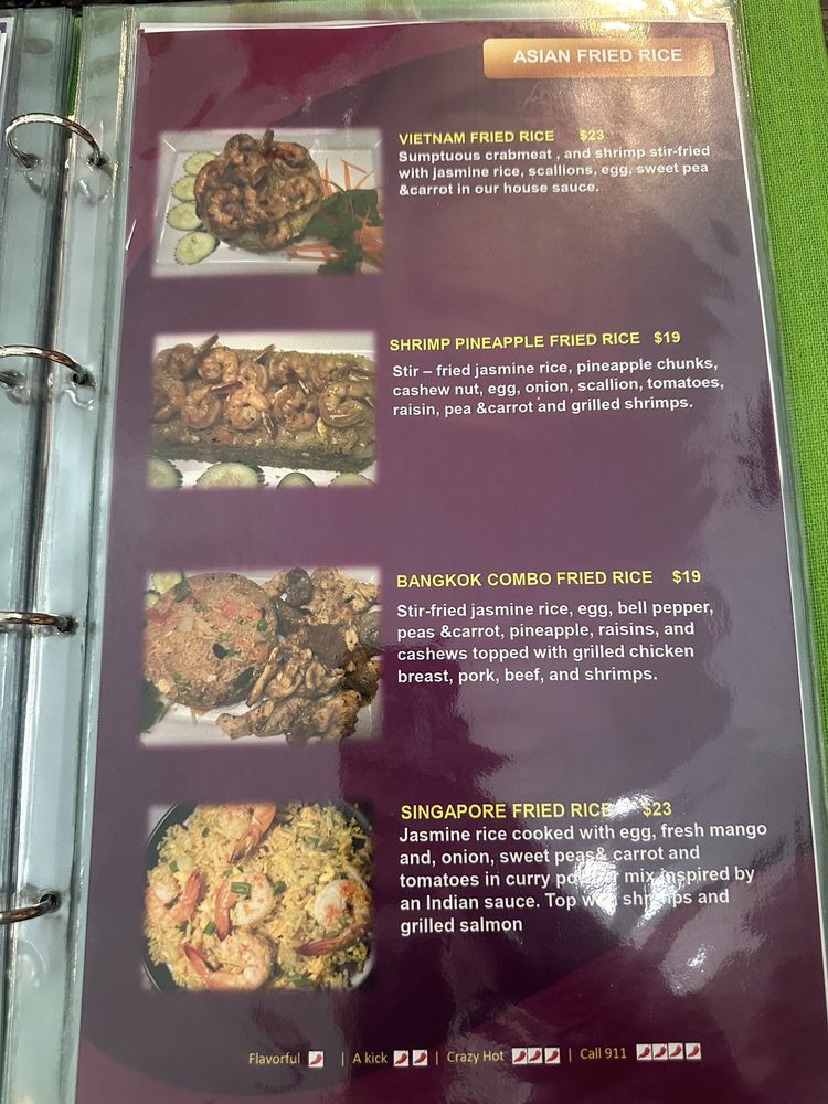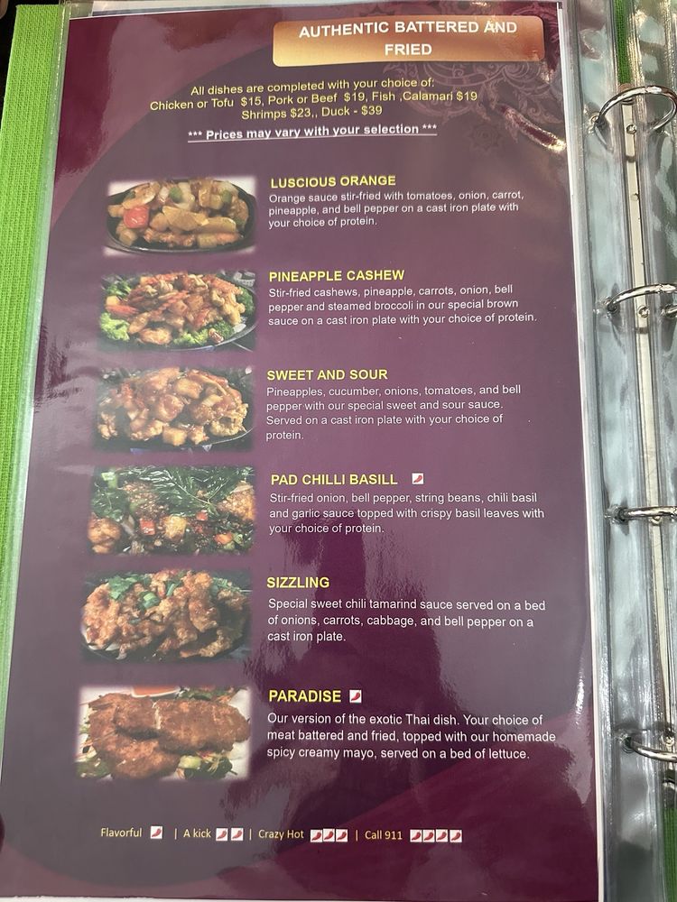 Highlights of the menu include the luscious Almond Chicken Curry, featuring tender chicken and garden vegetables, and the exquisite Duck Curry, a rich blend of roasted duck and Thai spices. For noodle lovers, the Drunken Noodles offer a tantalizing stir-fry, bursting with freshness and heat.